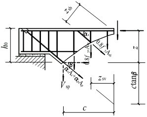 式中:M——构件斜截面受压区末端的弯矩设计值; Vcs——构件斜截面上混凝土和箍筋的受剪承载力设计值,按本规范式(6.3.4-2)计算,其中 h0取斜截面受拉区始端的垂直截面有效高度; Vsp——构件截面上受拉边倾斜的纵向非预应力和预应力受拉钢筋的合力设计值在垂直方向的投影:对钢筋混凝土受弯构件,其值不应大于 fyAssinβ;对预应力混凝土受弯构件,其值不应大于(fpyAp+fyAs)sinβ,且不应小于 σpcApsinβ; zsv——同一截面内箍筋的合力至斜截面受压区合力点的距离; zsb——同一弯起平面内的弯起钢筋的合力至斜截面受压区合力点的距离; z——斜截面受拉区始端处纵向受拉钢筋合力的水平分力至斜截面受压区合力点的距离,可近似取为 0.9h0; β——斜截面受拉区始端处倾斜的纵向受拉钢筋的倾角; c——斜截面的水平投影长度,可近似取为 h0。